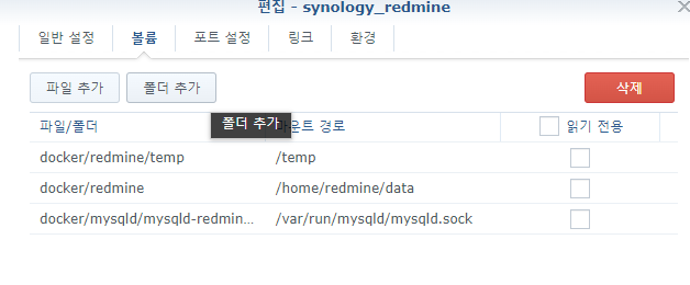 3. docker - 컨테이너(redmine) - 우클릭_편집 - 볼륨에서 temp 폴더끼리 연결합니다. (백업 2.C 참조)
