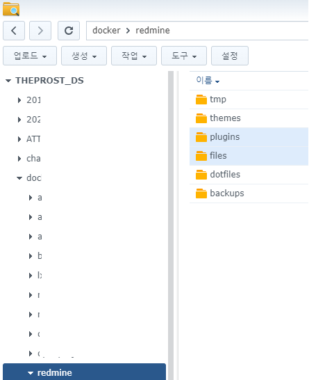 Dsm으로 접속하여 File Station : docker - redmine - plugins 및 files를 압축하여 보관합니다.