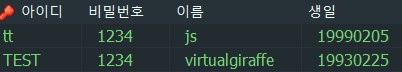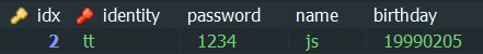 SELECT identity AS '아이디', password AS '비밀번호', name AS '이름', birthday AS '생일' FROM USER WHERE name='js';
