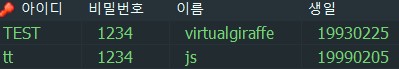 SELECT identity AS '아이디', password AS '비밀번호', name AS '이름', birthday AS '생일' FROM USER WHERE name='js';