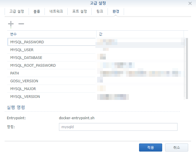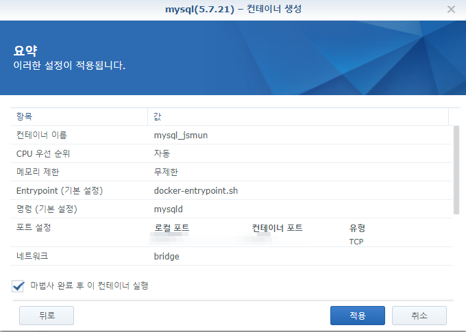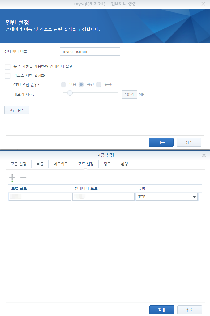 컨테이너 이름을 설정하고 ※고급 설정\포트 설정으로 이동하여 포트 설정을 합니다.