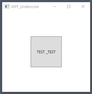 <Window x:Class="WPF_Underscore.MainWindow" xmlns="http://schemas.microsoft.com/winfx/2006/xaml/presentation" xmlns:x="http://schemas.microsoft.com/winfx/2006/xaml" xmlns:d="http://schemas.microsoft.com/expression/blend/2008" xmlns:mc="http://schemas.openxmlformats.org/markup-compatibility/2006" mc:Ignorable="d" Title="WPF_Underscore" Height="300" Width="300"> <Button Width="100" Height="100" Content="_TEST __TEST"/> </Window>_TEST 문자열은 accessKey로 분류되어 TEST로 출력되고 두번째 __TEST는 원하는 결과값인 _TEST로 정상적으로 출력됨.