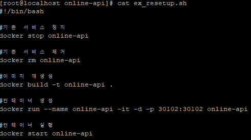 #!/bin/bash #기존 서비스 정지 docker stop online-api #기존 서비스 제거 docker rm online-api #이미지 재생성 docker build -t online-api . #컨테이너 생성 docker run --name online-api -it -d -p 30102:30102 online-api #컨테이너 실행 docker start online-api exit 0③ 실행 : bash [스크립트 파일명]