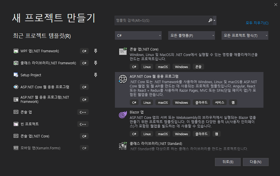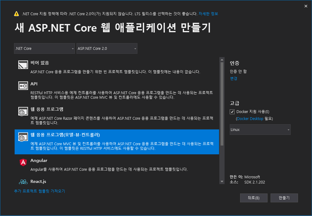 1. ASP.Net Core 프로젝트 생성 [설정값 : ASP.NetCore 2.0, MVC, docker:Linux]