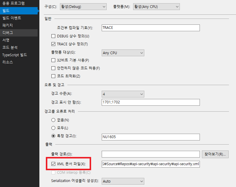 프로젝트 속성 - 빌드 - XML 문서 파일 항목 체크(summary값 xml로 출력)